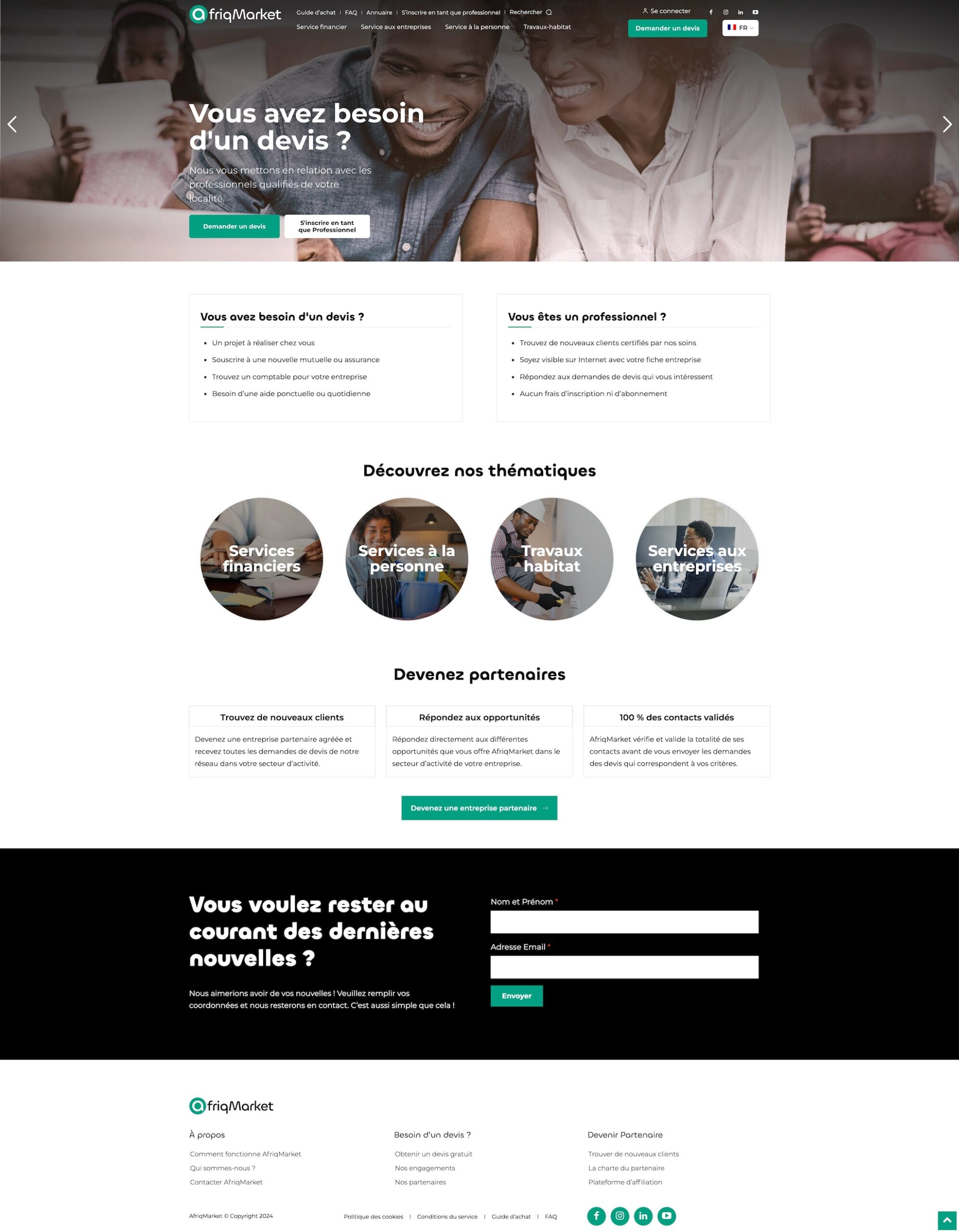 AfriqMarket permet aux particuliers, aux entreprises, associations ou collectivités publiques de déposer une demande de devis et de recevoir jusqu’à 3 réponses de professionnels qualifiés.